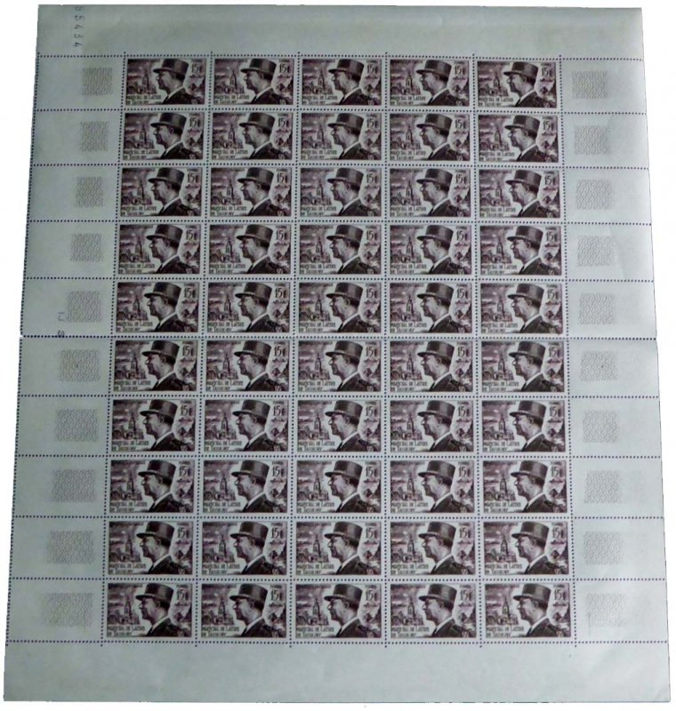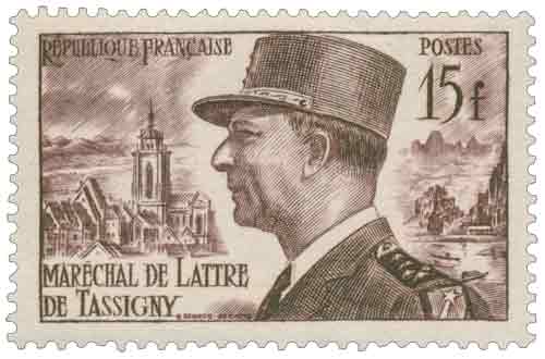 | Commentaire | Mis en vente en France à partir du 8 mai 1952 à Paris et à Mouilleron-en-Pareds, puis du 10 mai dans l’ensemble des bureaux du territoire, le timbre-poste à la gloire du Maréchal de Lattre de Tassigny s’inscrit dans les émissions commémoratives françaises honorant les grandes figures militaires contemporaines. Dessiné par Raoul Serres et gravé en taille-douce par Albert Decaris, ce timbre horizontal de 15 francs associe une iconographie symbolique à forte portée historique, évoquant à la fois la libération de Colmar, représentée par la collégiale Saint-Martin, et les pitons de Ninh Binh en Indochine, rappel du dernier commandement du général et du sacrifice de son fils. L’émission intervient quelques mois après la disparition de de Lattre de Tassigny, maréchal de France à titre posthume, et fait écho à son rôle déterminant dans la campagne de 1944-1945 à la tête de la 1ʳᵉ Armée française, jusqu’à la signature de la capitulation allemande à Berlin le 8 mai 1945. Affecté à l’affranchissement de la lettre simple pour l’intérieur, ce timbre associe usage postal courant et célébration d’une figure majeure de l’histoire militaire française du XXᵉ siècle.