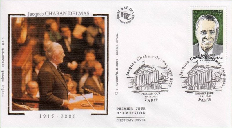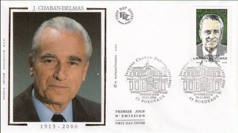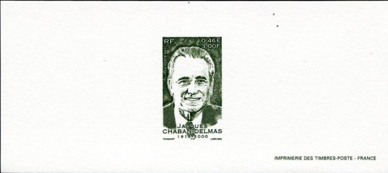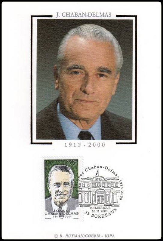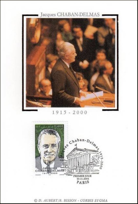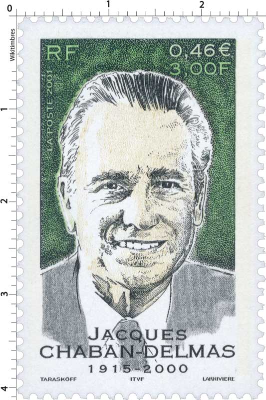 | Commentaire | Description synthétique du visuel du timbre : Né le 07 mars 1915 à Paris, étudiant en droit et sciences politiques tout en étant journaliste, jeune résistant durant les années de guerre, il entra dans l’Histoire en 1944 lors de la libération de Paris. Élu député de la Gironde en 1946, puis maire de Bordeaux l’année suivante, il fut nommé à 3 reprises Président de l’Assemblée Nationale, de 1958 à 1969, de 1978 à 1981 et de 1986 à 1988 et obtient la distinction de Président d’honneur le 12 novembre 1996. Il fut l’un des artisans de l’ouverture au centre et le promoteur de la « nouvelle société » à Matignon. Portrait de Marc Taraskoff |