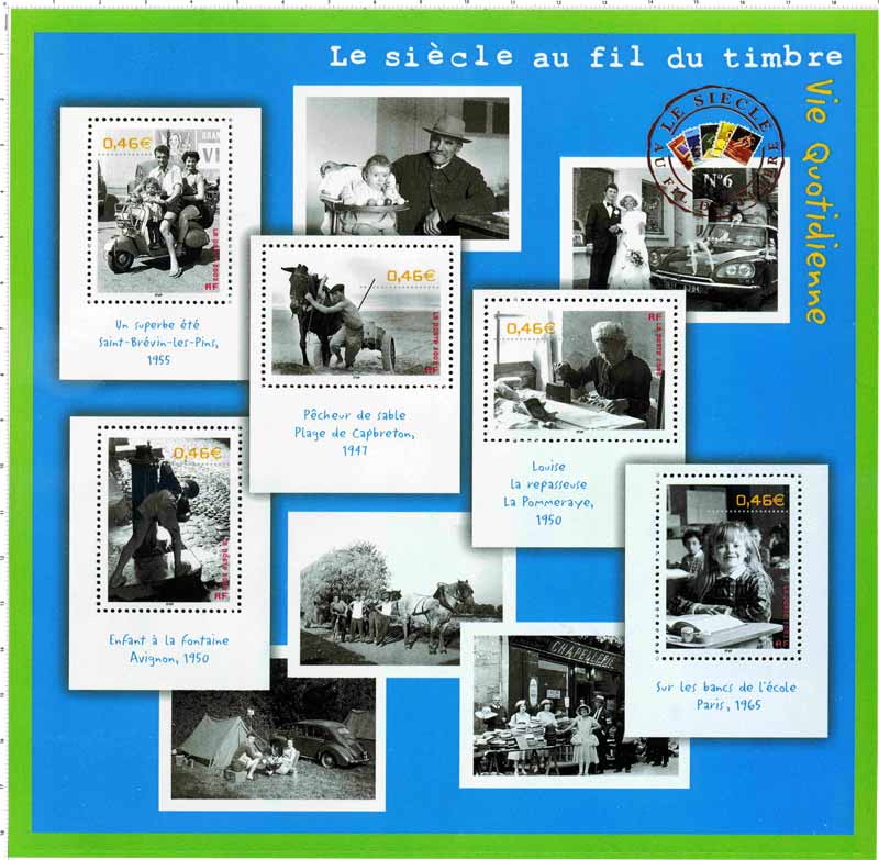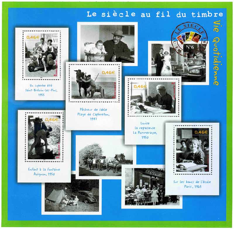 | Commentaire | Description synthétique du visuel du produit : Ce produit est le sixième et dernier bloc de la collection Le siècle au fil du timbre. Pour ce dernier bloc, il a été proposé aux Français d’ouvrir leur album de famille et d’envoyer des photos qu’ils jugeaient emblématiques du siècle passé. Les photos les plus plébiscitées suite à un sondage auprès du grand public figurent en timbres : Un superbe été, Saint-Brévin-les-Pins, 1955, Pêcheur de sable, Plage de Capbreton, 1947, Louise la repasseuse, La Pommeraye, 1950, Enfant à la fontaine, Avignon, 1950, Sur les bancs de l’école, Paris, 1965. Cinq autres photos ont été sélectionnées pour illustrer le fond du bloc : Papy et son petit-fils, Les mariés, Charrette de foin, Couple au camping, La chapellerie. L’impression des photos en noir et blanc, synonyme d’émotion, et présentant un effet polaroïd sur les timbres, contribuent à un effet graphique élégant. Pour conserver la logique de collection, le format, le cachet d’oblitération et la typographie du titre ont été conservés. |