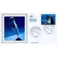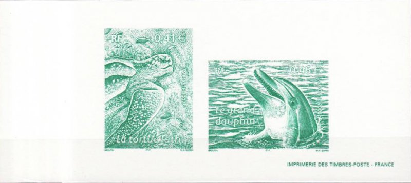 | Commentaire | Description synthétique du visuel du timbre : Les 4 animaux retenus évoluent dans une scène aquatique offrant la vision d’un océan et de son fond sous-marin. Des éléments divers, caractéristiques de cet environnement, animent la composition : corail, méduse, poissons, anémone de mer, algues. Sont mis en scène : une tortue luth, dont la carapace allongée est dépourvue d’écailles, un orque, le plus grand des cétacées, un grand dauphin au corps assez élancé et museau épais relativement court, et un phoque veau marin au corps et tête arrondis. |