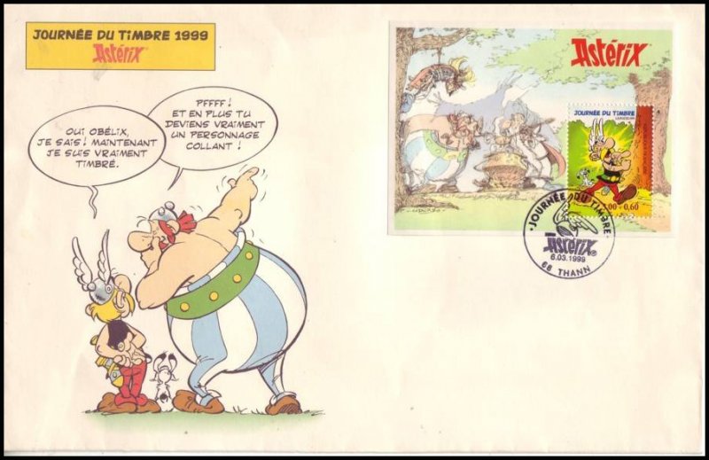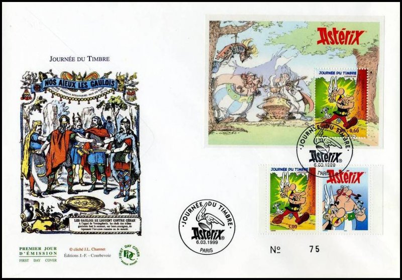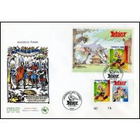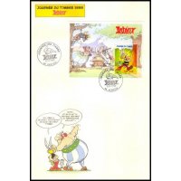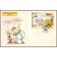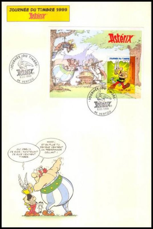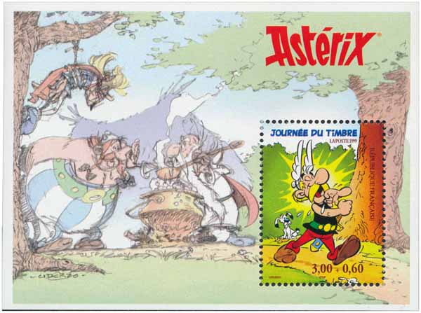 | Commentaire | bloc-fresque comprenant un timbre-poste Description synthétique du visuel du timbre : Le bloc-fresque est illustré d’un crayonné original d’Albert UDERZO. Le timbre comporte des couleurs très vives, tel une image de bande dessinée. Au contraire, le fond du bloc-fresque est légèrement colorisé afin de mettre en évidence les traits du crayonné. Les personnages les plus typiques de la série Astérix sont mis en scène : Astérix, petit guerrier à l’esprit malin vient de boire la potion magique d’où il tire sa force surhumaine. Obélix, l’inséparable ami d’Astérix, se voit privé de potion magique, ce qui a pour effet d’attrister son chien Idéfix. Panoramix, le druide vénérable est le talentueux préparateur de potions magiques. Tous ont pris soin de bâillonner le barde Assurancetourix au talent fort discuté. |