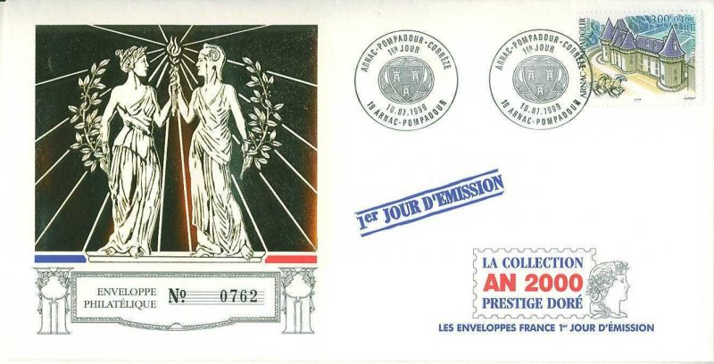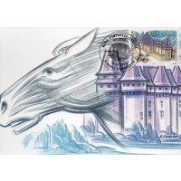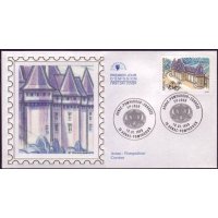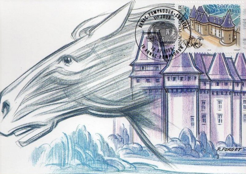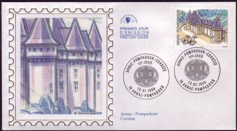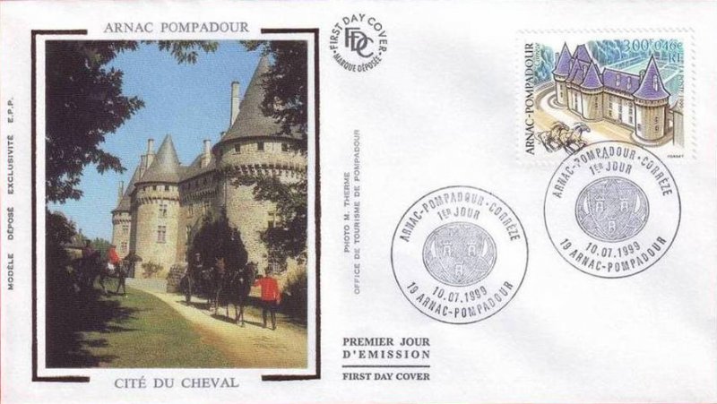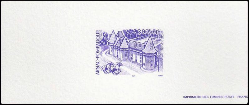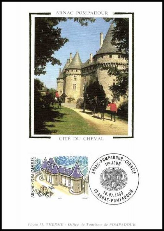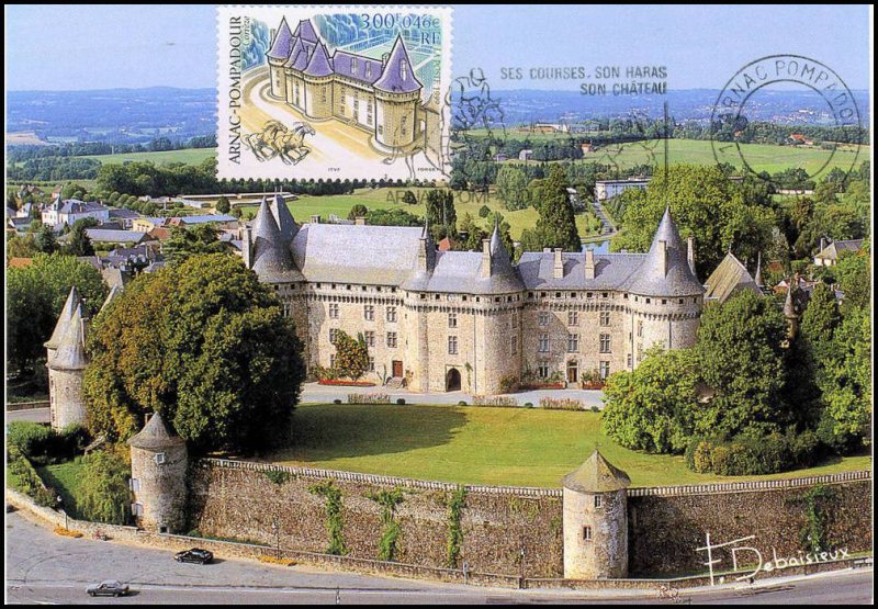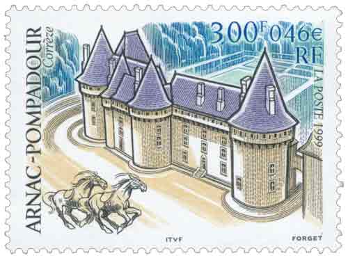 | Commentaire | Description synthétique du visuel du timbre : A l’origine, un fort fut construit en 1026 par Guy de LASTOURS pour défendre ses possessions. Incendié vers 1200, c’est un somptueux château qui fut reconstruit au XVe siècle sur la motte féodale, grâce à Geoffroy HELIE de POMPADOUR, alors prévôt d’ARNAC. Le visuel du timbre met en scène une vue aérienne de l’imposant château dont les tours coiffées de poivrière découpent sur la verdure la dentelure de leurs toits. Arnac-Pompadour ne peut être cité sans évoquer le cheval, animal à qui la ville doit le développement de son tourisme. Le château lui-même abrite par ailleurs le siège de l’Administration du Haras. |