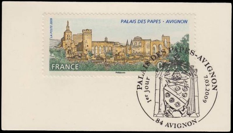 | Commentaire | La manifestation premier jour, dont le timbre à date de Claude Perchat représente les armes du pape Clément VI, a lieu les 7 et 8 mars au palais, à Avignon. Construit à partir de 1335, principalement par les deux papes bâtisseurs, Benoît XII et Clément VI, le Palais des Papes est le symbole du rayonnement de l'Église sur l’Occident chrétien au XIVe siècle. Entouré de remparts imposants, flanqué de quatre tours gigantesques, le monument est aujourd'hui le plus grand palais gothique du monde, et l'un des plus visité des monuments historiques en France. Il constitue - avec le Pont Saint Bénezet, les Remparts, le Petit Palais et la cathédrale des Doms - un ensemble architectural unique classé Patrimoine Mondial de l'Humanité par l'Unesco. Outre la visite de lieux riches d’histoire (fresques, appartements...), le Palais des Papes offre est aussi le siège de nombreux et célèbres événements culturels, dont le Festival d'Avignon créé par Jean Vilar en 1947. |