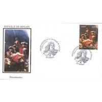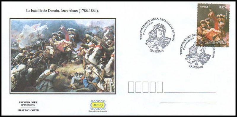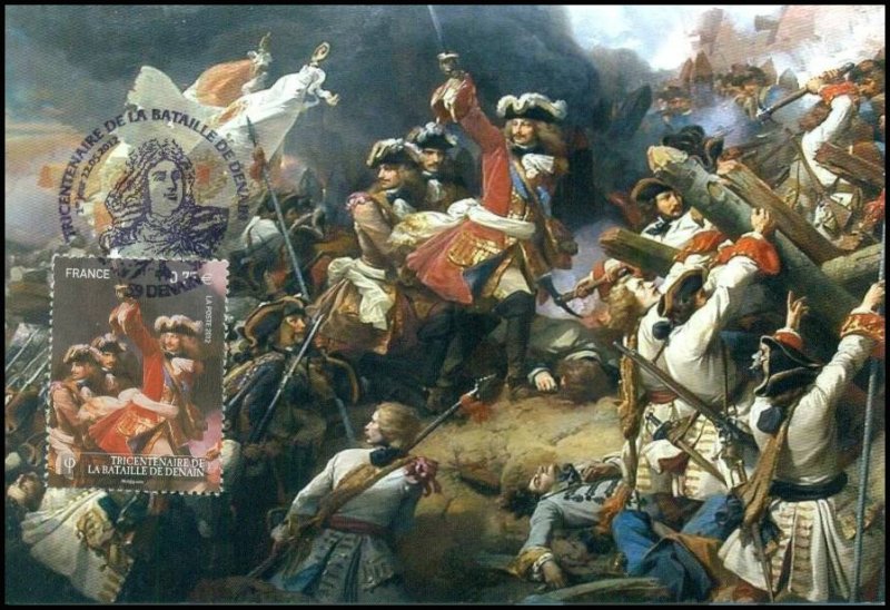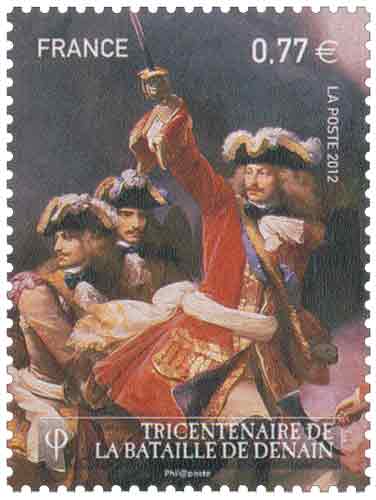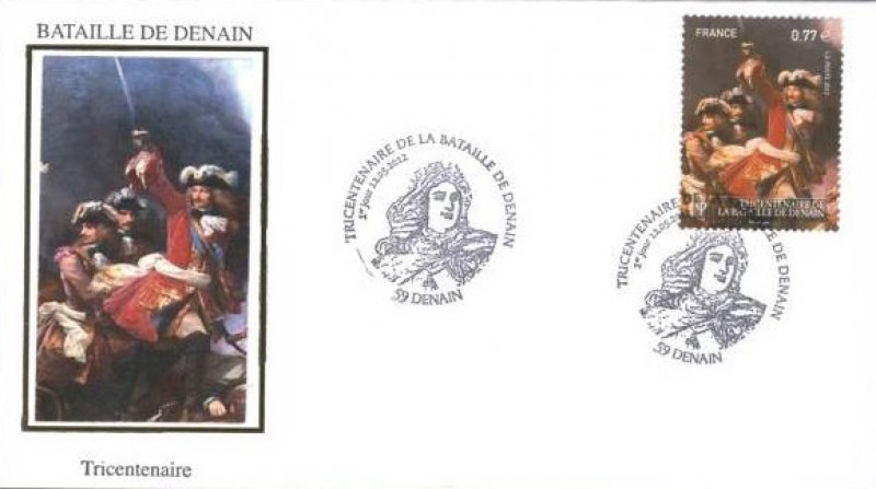 | Commentaire | Le 23 juillet 1712, ce sont plus de 200 000 hommes qui sont massés à la frontière du Nord, entre Douai et Marchiennes, et qui attendent l’ordre de porter l’attaque sous les ordres du Maréchal de Villars. La victoire qui s’ensuit fait de la bataille de Denain un tournant décisif dans la guerre de la succession d’Espagne. En effet, à la mort du roi d’Espagne Charles II, le trône se trouve sans héritier direct. Le petit-fils de Louis XIV est désigné comme successeur testamentaire, mais son accession se voit réfuter par la coalition austro anglo-germanique, inquiète de voir le pouvoir de la France et de l’Espagne tomber dans une seule main. Denain est en fait la dernière place forte avant Paris. Cette victoire du Maréchal de Villars à la tête de 52 bataillons contre les troupes anglaises et hollandaises, qui laissent près de 10 000 hommes sur le terrain, sauve la France de l’invasion. Cette guerre de succession se terminera le 11 avril 1713 avec le Traité d’Utrech. |