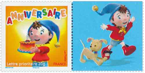 | Description | Timbre pour anniversaires. Depuis 2002, est utilisé un personnage de la fiction jeunesse : Oui-Oui tient un gâteau orné d'une bougie |