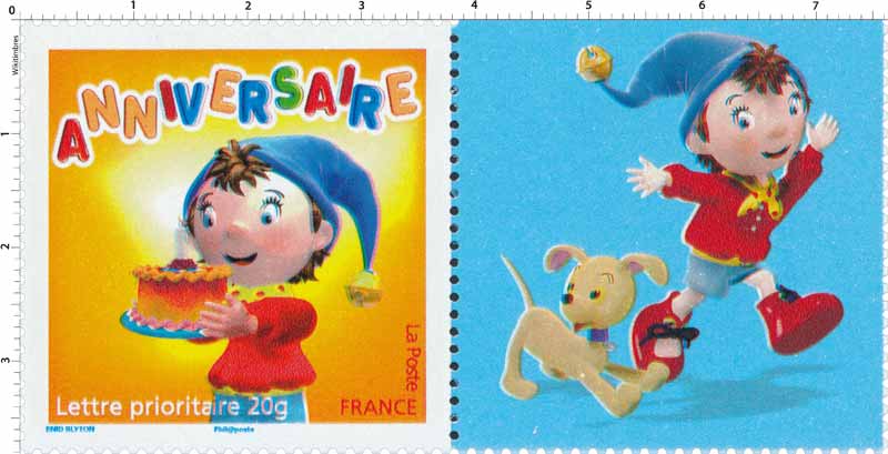 | Description | Timbre pour anniversaires. Depuis 2002, est utilisé un personnage de la fiction jeunesse : Oui-Oui tient un gâteau orné d'une bougie |