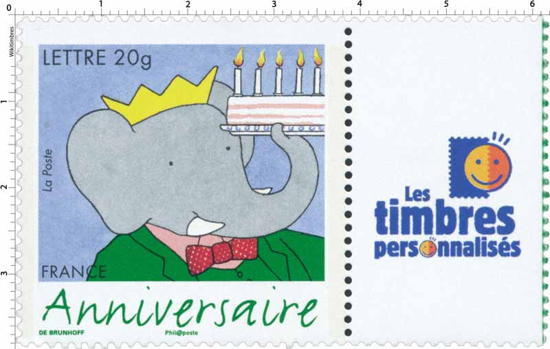 | Description | Timbre pour Anniversaires. Bande dessinée. 75 ans de l'éléphant Babar par l'auteur et dessinateur Jean de Brunhoff (1899-1937). Sans valeur indiquée (timbre à validité permanente - Lettre 20 g) |