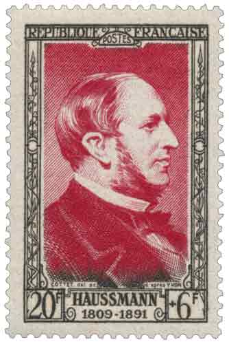 | Commentaire | voir la vidéo "Histoires de timbres" Le timbre émis en 1952 à l’effigie de Georges Eugène Haussmann appartient à la série « Célébrités du XIXᵉ siècle », qui met à l’honneur des personnalités ayant profondément marqué l’histoire politique, artistique et intellectuelle de la France. Préfet de la Seine de 1853 à 1870 sous le Second Empire, Haussmann demeure indissociable de la transformation radicale de Paris au milieu du XIXᵉ siècle. Chargé par Napoléon III de moderniser la capitale, il conduit un vaste programme d’urbanisme fondé sur l’élargissement des voies, la création de grands axes de circulation, l’aménagement de places monumentales, de parcs et de jardins, ainsi que sur la modernisation des réseaux d’eau, d’égouts et d’éclairage. Ces travaux, menés à une échelle inédite, modifient durablement la morphologie urbaine et l’image de Paris, tout en répondant à des objectifs à la fois sanitaires, économiques, esthétiques et politiques. Si son action suscita de vives critiques, notamment en raison des expropriations et de l’endettement qu’elle entraîna, elle posa les bases du Paris moderne et influença durablement l’urbanisme européen. Le choix de représenter Haussmann sur un timbre en 1952 souligne la reconnaissance institutionnelle de son rôle majeur dans l’histoire urbaine et administrative française.