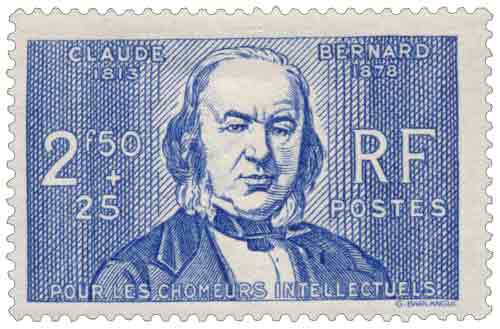 | Commentaire | Le timbre semi-postal à 2,50 francs + 25 centimes outremer, dessiné et gravé par Gabriel-Antoine Barlangue, portraiture Claude Bernard, fondateur de la médecine expérimentale et introducteur des concepts de milieu intérieur et d'homéostasie qui fondent la physiologie moderne. Imprimé en taille-douce rotative par feuilles de 25 sur presse n° 5, dentelé 13, il est mis en vente le 12 novembre 1940 dans la cinquième série au profit des chômeurs intellectuels via la Confédération des Travailleurs Intellectuels, sert aux lettres simples pour l'étranger après l'ajustement tarifaire et est retiré le 26 février 1941, tiré à 1,61 million d'exemplaires. |