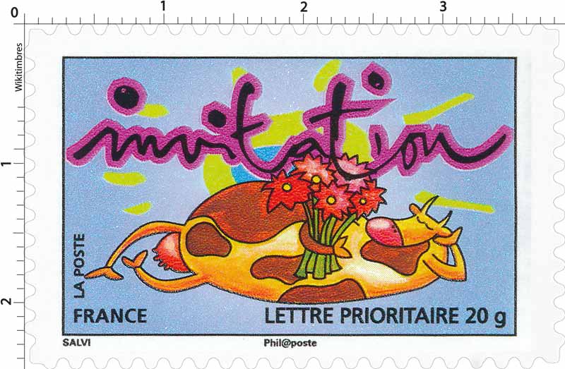 | Commentaire | La mise en vente anticipée a lieu le 5 septembre au Jardin d'acclimatation de Paris. Salvi reprend un de ses personnages en plein saut pour illustrer le cachet premier jour. « votre bonne humeur », « vos bonnes nouvelles », « votre enthousiasme », « vos envols », « vos fantaisies », « votre joie de vivre », « vos mots doux », « vos mystères », « votre patience », « vos promesses », « vos secrets », « vos surprises » ou « tous vos élans ». Timbre sans millésime |