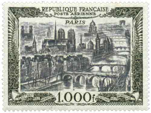 | Commentaire | Une partie de son tirage a été surchargée en francs CFA pour qu'il puisse servir à la Réunion. Ce dernier timbre est plus rare que la version de métropole aussi bien en neuf qu'en oblitéré. Ce TP existe avec le fond blanc - réf Y&T PA29b Visuel : Ile St-Louis (quai d'Anjou et ponts "Marie" et "Louis Philippe") – Ile de la Cité, avec l'enfilade de ponts sur la Seine, les quais aux Fleurs et de la Corse - la façade Nord-Est de la cathédrale Notre-Dame, avec les arcs-boutants, la toiture, la flèche et les deux tours - le quai de l'Horloge, avec l'ensemble du Palais de la Cité (du Xe au XIVe siècle), aujourd'hui le Tribunal de Paris et ancienne prison de la Conciergerie. (depuis 1370), et la Ste-Chapelle (1242-1248) – arrière plan, rive droite (Nord) : le pavillon de Flore (Musée du Louvre) et l'Arc de Triomphe - arrière plan, rive gauche (Sud) : l'église St-Séverin (XIIIe au XVe siècle, à gauche de Notre-Dame), à l'arrière : l'église St-Sulpice le Pieux (1646- 1870) - l'église abbatiale de St-Germain-des-Près (ancienne abbaye, de 558 à la Révolution) et le dôme de l'Hôtel des Invalides (gauche de la Seine). |