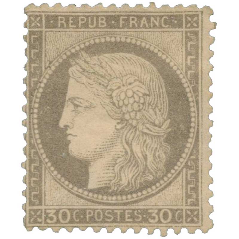 Le 30 centimes brun, n°56, paraît en septembre 1872, au même moment que le 80c, afin de compléter la série Cérès dentelée diffusée sous la IIIe République. Cette valeur reprend le type d’origine de 1849-1850, réutilisé grâce aux galvanos conservés par Anatole Hulot, pratique courante pour assurer une continuité visuelle et accélérer la production.