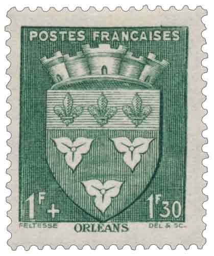 | Commentaire | Ce timbre gommé émis en 1942 appartient à la deuxième série des Armoiries des villes de France, ensemble semi-postal destiné à valoriser l’héraldique urbaine tout en contribuant financièrement au Secours National. Il représente les armoiries d’Orléans, « de gueules à trois cœurs de lis d’argent, au chef cousu d’azur chargé de trois fleurs de lis d’or », emblème rappelant l’ancien statut royal de la cité. Dessiné et gravé par Émile Feltesse, le timbre est imprimé en taille-douce rotative, technique assurant une restitution nette des motifs héraldiques dans un format réduit. La valeur faciale de 1 franc, assortie d’une surtaxe de 1,30 franc, correspond à des usages spécifiques de suppléments d’affranchissement et d’assurance, caractéristiques des émissions d’octobre 1942, où l’affranchissement s’accompagne systématiquement d’une contribution obligatoire, reflet du contexte économique et social de l’Occupation. |