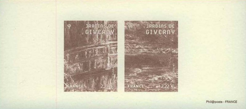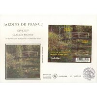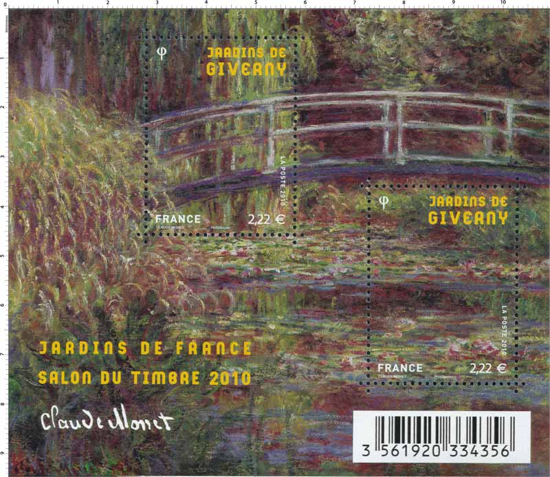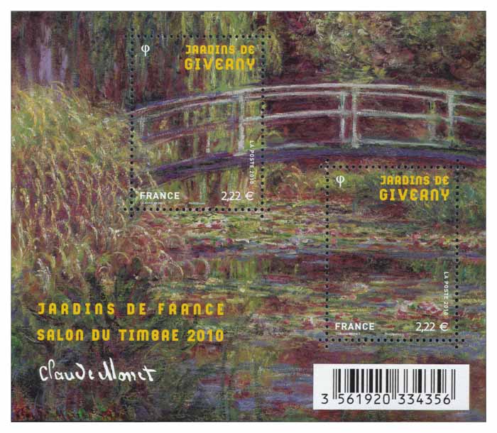 En 1893, Monet achète le terrain qui jouxte sa propriété. Il est traversé par un petit cours d'eau, le Ru, une dérivation de l'Epte. Malgré l'opposition des agriculteurs voisins, Monet y fait creuser un premier petit bassin. Dans une lettre au préfet de l'Eure, il déclare : « Il ne s'agit là que d'une chose d'agrément et pour le plaisir des yeux, et aussi d'un but de motif à peindre , je ne cultive dans ce bassin que des plantes telles que nénuphars, roseaux, iris de différentes variétés qui croissent généralement à l'état spontané le long de notre rivière ». Le bassin sera plus tard agrandi pour atteindre ses proportions d'aujourd'hui. On trouve dans ce jardin d'eau le fameux pont japonais couvert de glycines, d'autres ponts plus petits, des saules pleureurs, une forêt de bambous, et surtout les fameux nymphéas qui fleurissent pendant tout l'été. Monet y puise son inspiration pendant plus de vingt ans. Après la série des ponts japonais, il se consacre à celle des nymphéas, jusqu'aux gigantesques décorations de l'Orangerie. C’est une de ses œuvres conservées au musée d’Orsay « Le bassin aux nymphéas, harmonie rose » qui illustre le bloc Jardins de France en 2010. INFOS PRATIQUES PREMIER JOUR : 12 juin 2010 Vente Anticipée à Paris - Salon du Timbre à Giverny (27) |