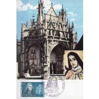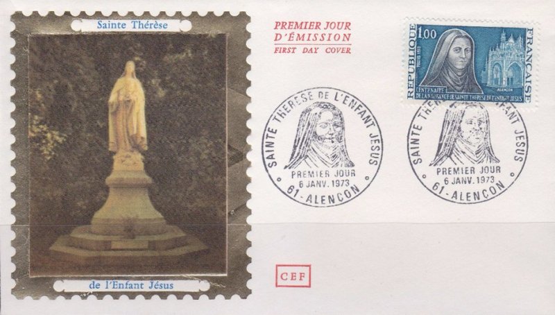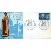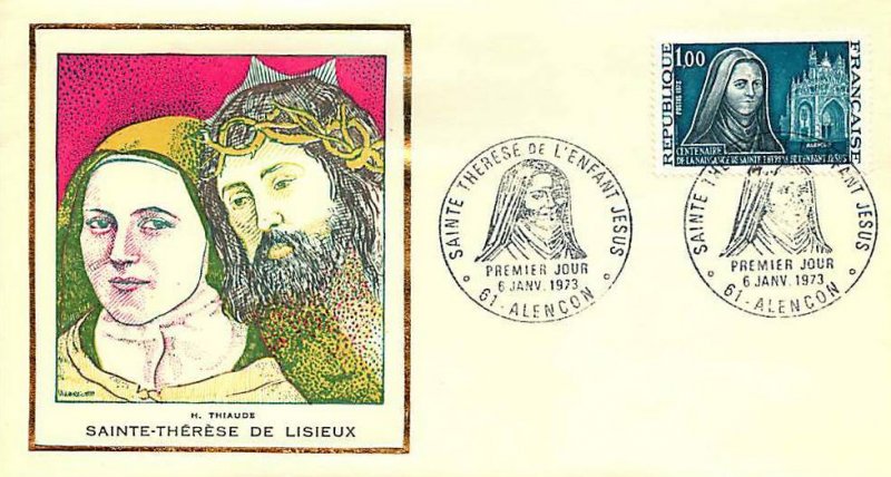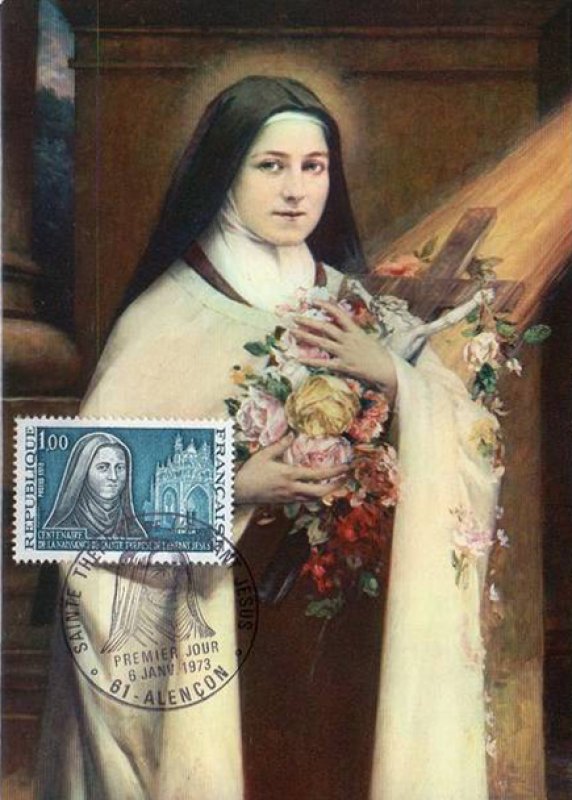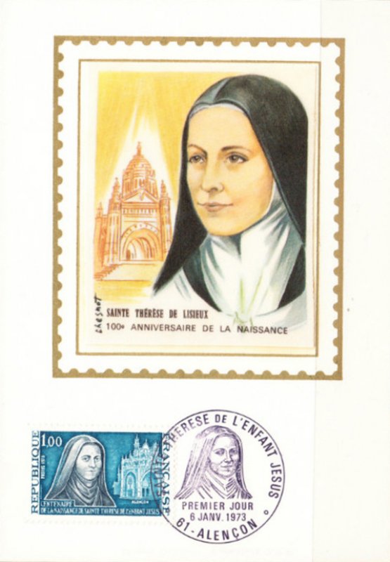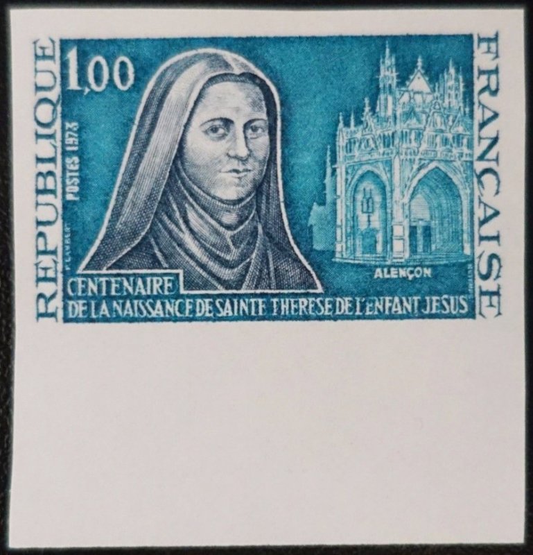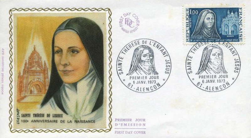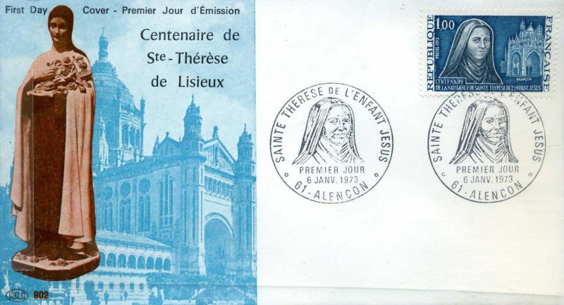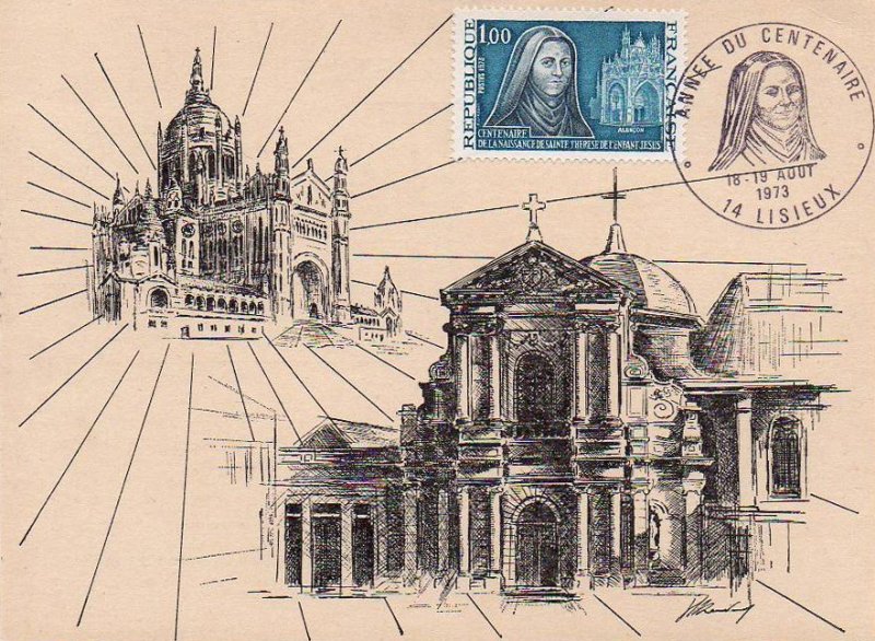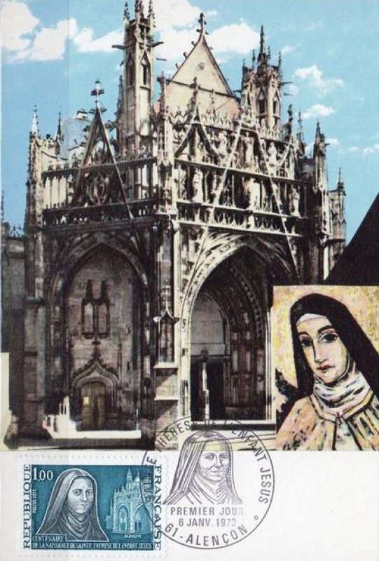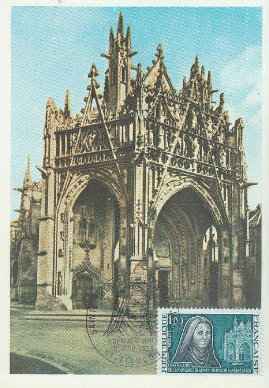 | Description | Centenaire de la naissance de sainte Thérèse de l'Enfant-Jésus (1873-1897), née à Alençon, religieuse carmélite, canonisée dès 1925, et représentation du porche de l'église Notre-Dame d'Alençon |
