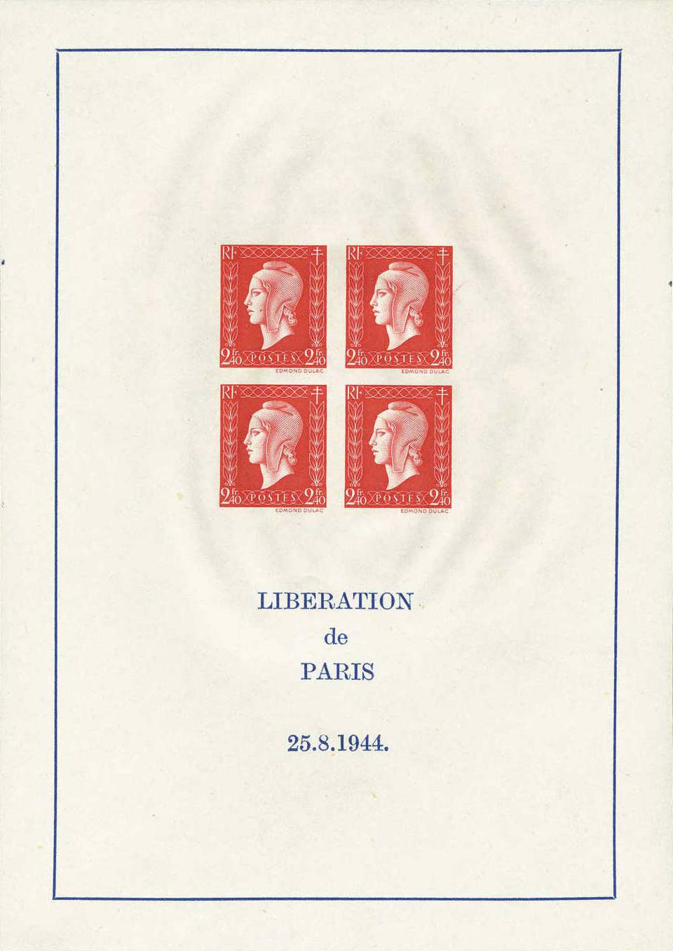 | Description | Non émis. Marianne de Dulac. T.-P. de même date réunis en bloc de quatre sur feuillets de 121x172 |