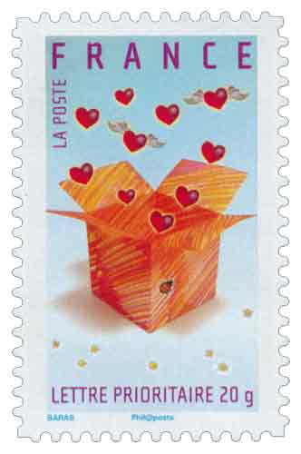 | Description | Timbres de messages. Invitation. Boîte d'où s'échappent des cœurs, issus du carnet de 5 TP Merci Invitation Festif, les timbres à stickers |