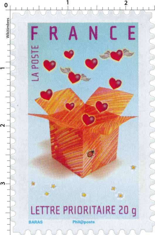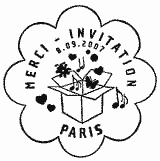 | Description | Timbres de messages. Invitation. Boîte d'où s'échappent des cœurs, issus du carnet de 5 TP Merci Invitation Festif, les timbres à stickers |