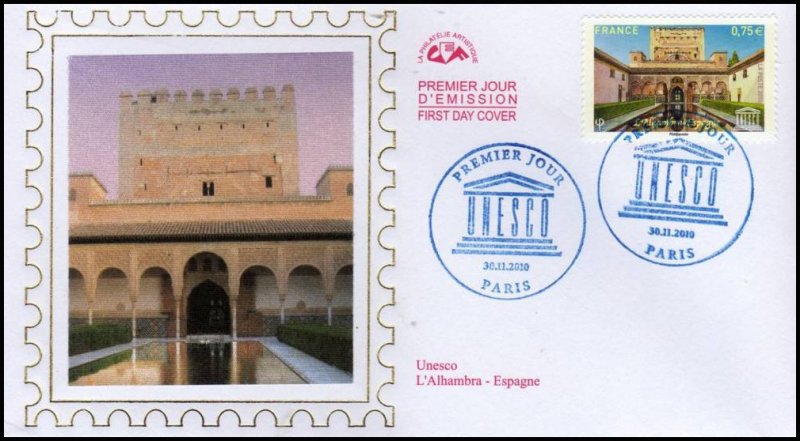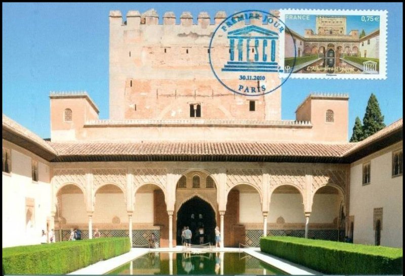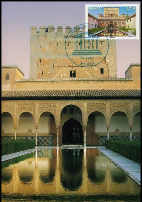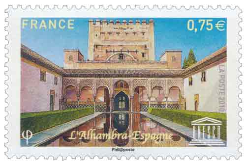 | Commentaire | C’est le 1er souverain nasride Muhammad V qui décida la construction de l'Alhambra en 1238. Sur le timbre figure le patio des Myrtes, autour duquel s’érige le palais de Yusuf 1er |