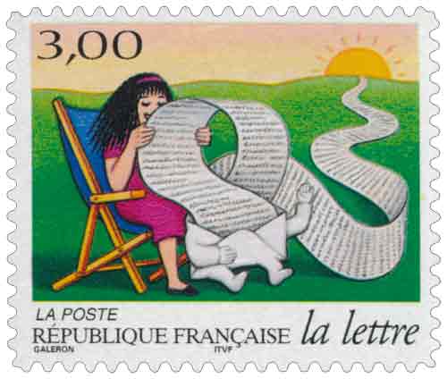 | Commentaire | Les journée de la lettre. Le voyage d'une lettre Sa longue et captivante lecture (émis en carnet auto adhésif) Timbre sans millésime |