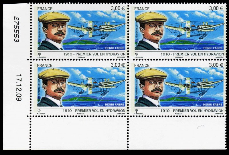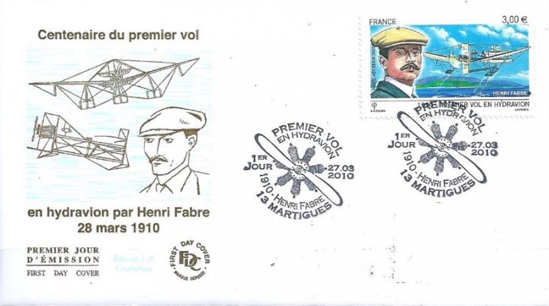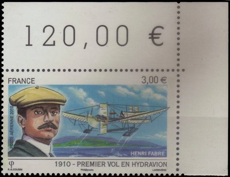 | Commentaire | INFOS PRATIQUES PREMIER JOUR : 27, 28 mars 2010 Vente Anticipée : à Martigues (13), à Biscarrosse (40) et à Paris Le Carré d’Encre Ingénieur français, né à Marseille en 1882, décédé en 1984, Henri Fabre a été l’inventeur, le constructeur et surtout le premier pilote de l’hydravion. Le 28 mars 1910, sur l’étang de Berre, dans les Bouches-du-Rhône, Henri Fabre fait décoller son hydravion, qu’il surnomme le « canard » (appareil dont le petit plan était à l’avant et le système propulsif à l’arrière). Après avoir glissé sur cinq cents mètres, l’appareil s’envola et se posa sans difficulté. Au second vol, il parcourut 800 mètres et monta à plus de 5 mètres. Après l’hydravion de Fabre, de nombreux appareils furent réalisés. Cette invention de l’hydravion a ainsi ouvert un formidable champ de possibilités à l’aviation balbutiante de cette époque. Pour commémorer le centenaire de l’hydravion, La Poste éditera un timbre en 2010. Ce timbre a également été émis en feuillet de 10 TP et est dentelé 13 et comporte des impressions sur les marges du feuillet. Le timbre de feuille comme le timbre du feuillet de 10 TP sont imprimés sur papier neutre sous UV. |