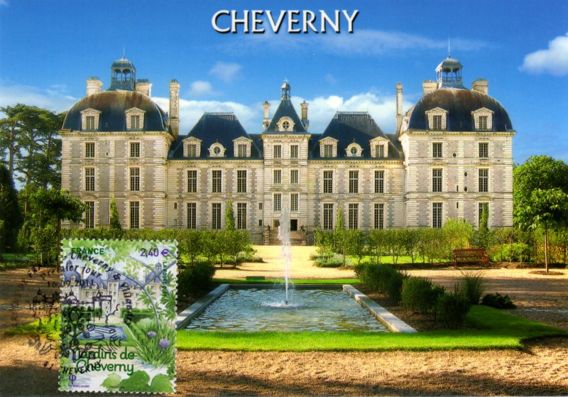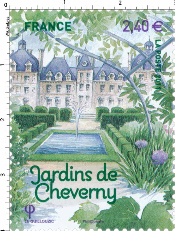 | Commentaire | Les jardins du Château de Cheverny se composent d'un Parc à L'anglaise où de Larges parterres de gazon mettent en valeur des arbres d'essences rares plantés au XIXe siècle, et de deux créations contemporaines hautes en couleurs : Le Jardin des Apprentis, représenté sur Le timbre, et Le Jardin Potager. Les jardins à La Française du Château de Villandry Furent créés en 1906 par Le Docteur Joachim Carvalho dans Le plus pur esprit de La Renaissance. Ils se composent d'un jardin potager inspiré de ceux des monastères, de deux jardins d'ornement illustrant L'amour et La musique et d'un jardin d'eau |
