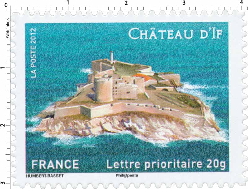 | Commentaire | Timbre à date “Premier Jour” conçu par Grenade. Émis lors du salon du timbre 2012 Historique : fortification édifiée sur ordre du roi François 1er, sur l'îlot d'If, dans l'archipel du Frioul, au centre de la rade de Marseille. Il a servi de prison pendant 400 ans d'utilisation officielle. Il est célèbre grâce au roman d'Alexandre Dumas "Le Comte de Monte-Cristo". |