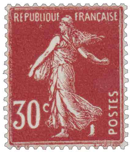 Émis le 13 avril 1937, ce timbre est une réimpression tardive de l'iconique Semeuse de Roty, l'un des types courants français les plus célèbres, créé par Louis-Oscar Roty et gravé par Louis Eugène Mouchon. Cette version est du type "fond plein sans sol" et se distingue par sa couleur rouge foncé et sa valeur faciale de 30 centimes. Imprimé en typographie à plat, ce timbre vertical était principalement destiné à couvrir des tarifs spécifiques et peu courants en 1937, tels que la taxe pour les objets insuffisamment affranchis ou l'affranchissement des échantillons (deuxième échelon de poids). Malgré sa création ancienne, la Semeuse restait un pilier de l'affranchissement postal français, la couleur étant ajustée à la valeur selon les directives de l'Union Postale Universelle. Bien que les chiffres exacts de son tirage soient inconnus, la longue période de disponibilité de cette émission, retirée de la vente seulement le 28 décembre 1940, assure sa présence régulière dans les collections.