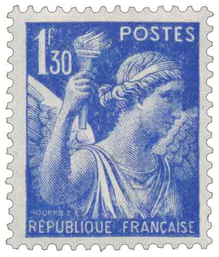 | Commentaire | 1er tarif Le timbre à 1,30 franc outremer de la série Iris, dessiné et gravé par Georges Hourriez, figure la déesse messagère des dieux dans la mythologie grecque, allégorie de la transmission adaptée aux besoins postaux de la fin de la Troisième République. Imprimé en typographie rotative par feuilles de 100, dentelé 14 × 13½, il est mis en vente le 8 janvier 1940 pour répondre à certains tarifs intérieurs et internationaux avant les bouleversements de la guerre. Tiré à 11,7 millions d'exemplaires, il reste en usage jusqu'au remplacement progressif des séries Iris sous le régime de Vichy. |