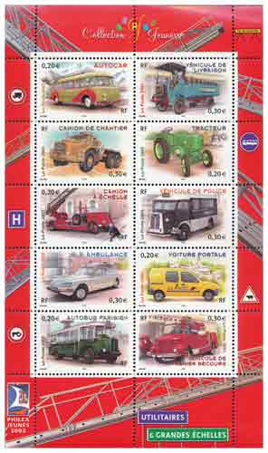 | Commentaire | UTILITAIRES & GRANDES ÉCHELLES Description synthétique du visuel du timbre : Dans la continuité des blocs précédemment émis Armada du Siècle, Voitures anciennes, les légendes du rail et Cylindrées & Carénages, le bloc Collection Jeunesse émis en 2003 met à l’honneur les véhicules utilitaires et de service : autocar (Isobloc type 648 DP 102), véhicule de livraison (Berliet 22 HP Type M), camion de chantier (Berliet T100), tracteur (Vierzon type 302), camion à échelle (Delahaye à échelle mécanique), véhicule de police (Citroën), ambulance (Heuliez & Citroën DS), voiture postale (Renault Kangoo), autobus parisien (Renault type TN6) et véhicule de premier secours (Hotchkiss type PL 50). |