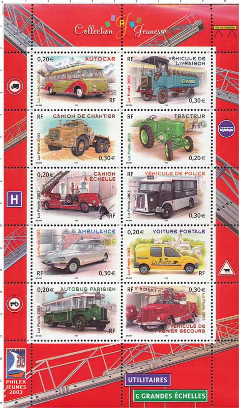 | Commentaire | UTILITAIRES & GRANDES ÉCHELLES Description synthétique du visuel du timbre : Dans la continuité des blocs précédemment émis Armada du Siècle, Voitures anciennes, les légendes du rail et Cylindrées & Carénages, le bloc Collection Jeunesse émis en 2003 met à l’honneur les véhicules utilitaires et de service : autocar (Isobloc type 648 DP 102), véhicule de livraison (Berliet 22 HP Type M), camion de chantier (Berliet T100), tracteur (Vierzon type 302), camion à échelle (Delahaye à échelle mécanique), véhicule de police (Citroën), ambulance (Heuliez & Citroën DS), voiture postale (Renault Kangoo), autobus parisien (Renault type TN6) et véhicule de premier secours (Hotchkiss type PL 50). |