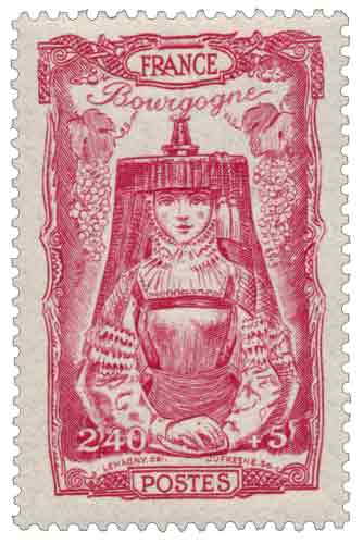 | Commentaire | Coiffe bressane En savoir plus sur Le Patrimoine du timbre français : page 313 Ce timbre gommé français de 1943 appartient à la série des coiffes régionales du XVIIIᵉ siècle, émission à vocation à la fois culturelle et sociale. La coiffe de Bourgogne, dessinée par Paul-Pierre Lemagny et gravée par Charles-Paul Dufresne, illustre une interprétation élégante du costume régional bourguignon tel qu’il pouvait être idéalisé à la fin de l’Ancien Régime. Comme l’ensemble de la série émise en décembre 1943, ce timbre est assorti d’une surtaxe obligatoire destinée au Secours National, organisme d’aide sociale du régime de Vichy. L’esthétique privilégie la sobriété et la lisibilité, avec une gravure en taille-douce au trait net, typique des productions de cette période. |