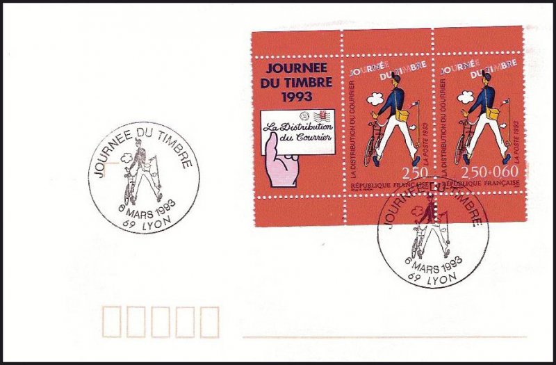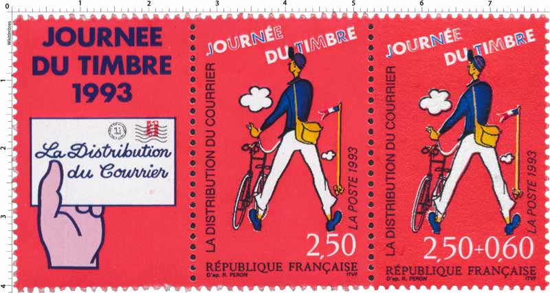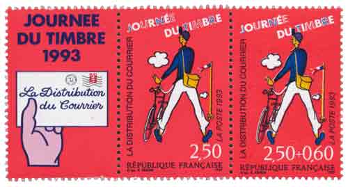 | Description | Journée du Timbre. Les métiers de la Poste. La distribution du courrier, d'après une affiche dessinée pour le film Jour de Fête de Jacques Tati |