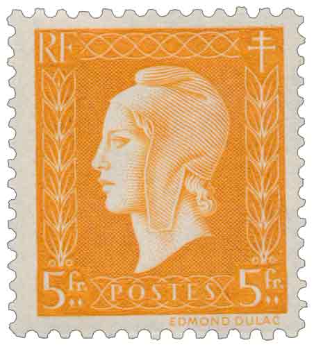 | Commentaire | Le timbre gommé de 5 francs orange de la série Marianne de Dulac, émis en France en 1945, appartient à la série courante utilisée dans l’immédiat après-Libération afin d’assurer la continuité du service postal dans un contexte de réorganisation administrative et tarifaire ; destiné principalement à l’affranchissement complémentaire, il permettait d’ajuster précisément les montants d’affranchissement à une période marquée par l’inflation et la multiplication des tarifs, tout en s’inscrivant dans une série emblématique réaffirmant les symboles républicains à travers la figure de Marianne, dessinée et gravée par Edmond Dulac, dont le style allégorique sobre et classique s’inscrit dans la tradition philatélique française, la gravure étant réalisée par Léonard Vincent Phillips et l’impression effectuée en taille-douce à plat, technique garantissant finesse du trait et lisibilité, ce timbre constituant également un témoignage du recours exceptionnel à l’imprimerie britannique Thomas de la Rue à Londres pour la production de timbres français en 1945. |