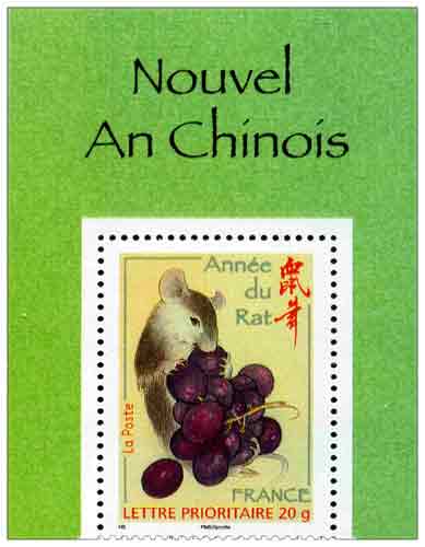 | Commentaire | Le 28 janvier, dans série annuelle entamée en 2005, est émis un bloc de cinq timbres pour la « LETTRE PRIORITAIRE 20g » à l'occasion du Nouvel An chinois. Mangeant le raisin d'une grappe, un rat signale le signe astrologique chinois de l'année qui débute le 7 février 2008. L’astrologie chinoise est basée sur les notions astronomiques, religieuses et calendériques traditionnelles. Le rat est le premier animal dans l’ordre d’arrivée qui apparaît dans le zodiaque chinois, lié au calendrier chinois. Le rat est décrit comme étant ambitieux, prompt à s’emporter et passionné. Timbre sans millésime |