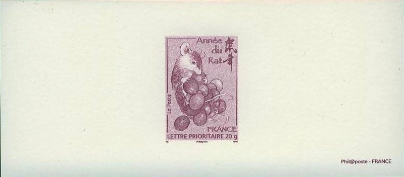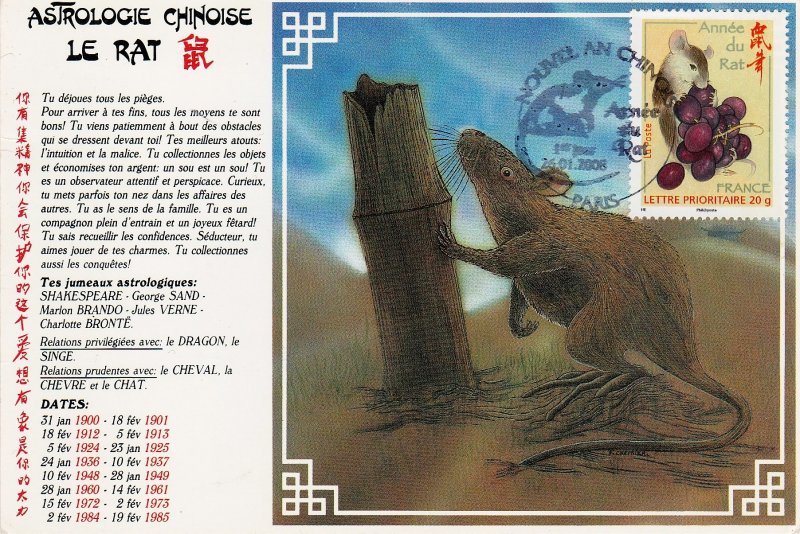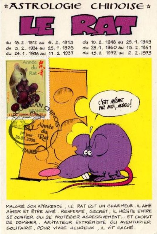 | Commentaire | Le 28 janvier, dans série annuelle entamée en 2005, est émis un bloc de cinq timbres pour la « LETTRE PRIORITAIRE 20g » à l'occasion du Nouvel An chinois. Mangeant le raisin d'une grappe, un rat signale le signe astrologique chinois de l'année qui débute le 7 février 2008. L’astrologie chinoise est basée sur les notions astronomiques, religieuses et calendériques traditionnelles. Le rat est le premier animal dans l’ordre d’arrivée qui apparaît dans le zodiaque chinois, lié au calendrier chinois. Le rat est décrit comme étant ambitieux, prompt à s’emporter et passionné. Timbre sans millésime |