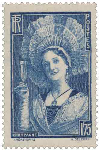 | Commentaire | Tricentenaire de Dom Pérignon (1,75 F) Ce timbre vertical de couleur bleu outremer a été émis en 1938 pour commémorer le tricentenaire de la naissance de Dom Pérignon (Pierre Pérignon, 1639-1715). Ce moine bénédictin est une figure clé dans l'amélioration des techniques de vinification du vin de Champagne, notamment par la méthode de l'assemblage de raisins de diverses origines. Description du Sujet Le timbre ne représente pas directement Dom Pérignon, mais une Champenoise (femme de la région Champagne), en la personne de l'actrice et artiste lyrique Janny Perjeanne (1882-1965). Elle est représentée vêtue d'une robe traditionnelle et coiffée du toquat, une coiffe typique de la région de Troyes et de Champagne, tenant une flûte de champagne à la main pour célébrer l'événement. Contexte de l'Émission et Utilisation Postale