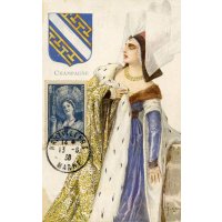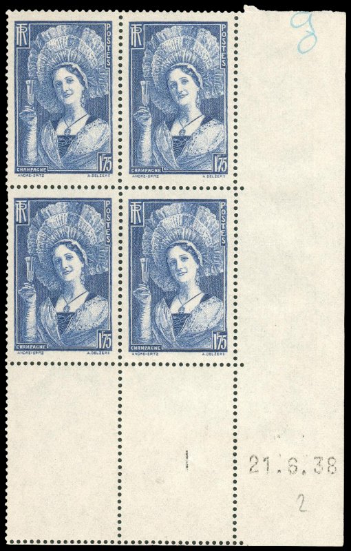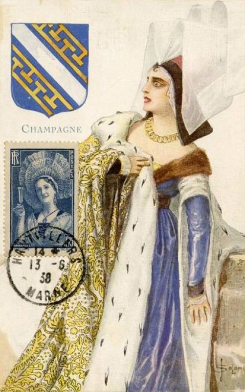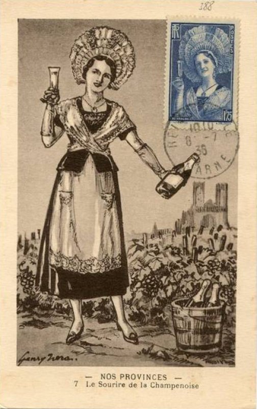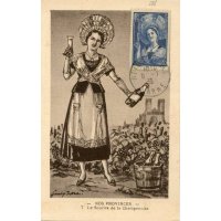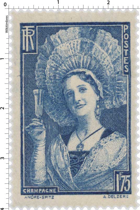 | Commentaire | Tricentenaire de Dom Pérignon (1,75 F) Ce timbre vertical de couleur bleu outremer a été émis en 1938 pour commémorer le tricentenaire de la naissance de Dom Pérignon (Pierre Pérignon, 1639-1715). Ce moine bénédictin est une figure clé dans l'amélioration des techniques de vinification du vin de Champagne, notamment par la méthode de l'assemblage de raisins de diverses origines. Description du Sujet Le timbre ne représente pas directement Dom Pérignon, mais une Champenoise (femme de la région Champagne), en la personne de l'actrice et artiste lyrique Janny Perjeanne (1882-1965). Elle est représentée vêtue d'une robe traditionnelle et coiffée du toquat, une coiffe typique de la région de Troyes et de Champagne, tenant une flûte de champagne à la main pour célébrer l'événement. Contexte de l'Émission et Utilisation Postale