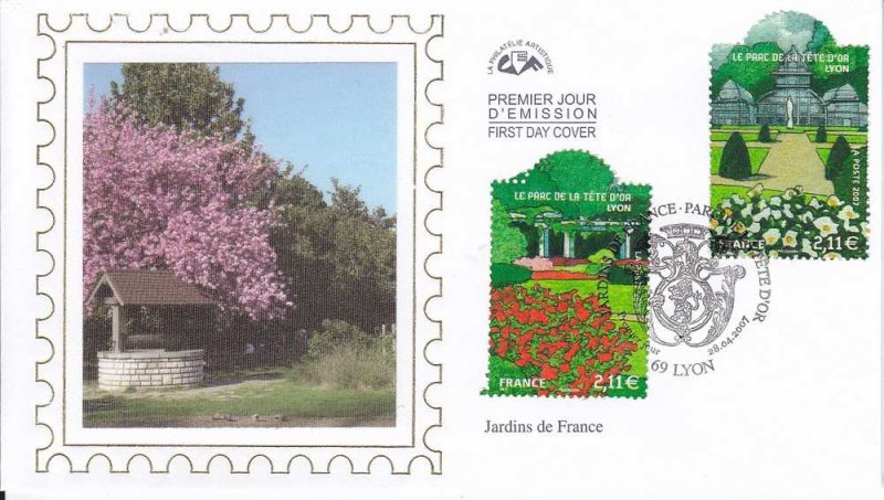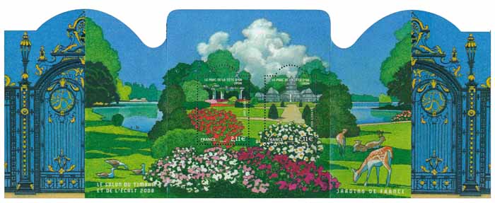 | Commentaire | LE SALON DU TIMBRE ET DE L’ÉCRIT 2008 JARDINS DE France Le Parc de la Tête d'Or, patrimoine lyonnais depuis 1856 est un des plus grands parcs situé au cœur d'une métropole européenne. Son nom Tête d'Or vient d'une légende selon laquelle un trésor avec une tête de Christ en or y a été enfouie. Il demeure aujourd'hui un des plus grands et plus beaux parcs urbains de France. Le Parc a quasiment gardé l’aspect de ses débuts – autour d’un lac, les vastes pelouses d'esprit romantique alternent avec des bosquets d'arbres plus que centenaires. Les massifs fleuris, les parterres de roses ou de pivoines, apportent en toutes saisons des touches colorées et parfumées. Il comporte aujourd’hui un zoo, un jardin botanique abritant l’une des plus riches collections d’Europe de plantes, quatre roseraies. La roseraie et les grandes serres illustrent les 2 timbres de ce bloc |
