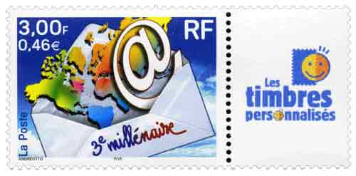 | Commentaire | bloc-feuillet de 10 timbres avec vignette. Description synthétique du visuel du timbre : Dans la série des semi-permanents, La Poste propose une mini-feuille de timbres dits personnalisés, permettant d’offrir au public un média de communication individuelle à travers le timbre. Il sera donné l’occasion à l’usager de créer ses propres timbres en faisant imprimer une photo de son choix sur la vignette accolée au timbre. La mini-feuille 3e millénaire sera également émise avec vignettes pré-illustrées. Le visuel, orienté nouvelles technologies, illustre le mariage du courrier et de l’internet, symbole de l’entrée dans le 3e millénaire. Timbre sans millésime |