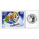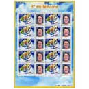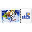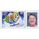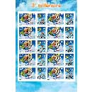 bloc-feuillet de 10 timbres avec vignette. Description synthétique du visuel du timbre : Dans la série des semi-permanents, La Poste propose une mini-feuille de timbres dits personnalisés, permettant d’offrir au public un média de communication individuelle à travers le timbre. Il sera donné l’occasion à l’usager de créer ses propres timbres en faisant imprimer une photo de son choix sur la vignette accolée au timbre. La mini-feuille 3e millénaire sera également émise avec vignettes pré-illustrées. Le visuel, orienté nouvelles technologies, illustre le mariage du courrier et de l’internet, symbole de l’entrée dans le 3e millénaire. Timbre sans millésime
