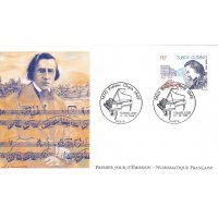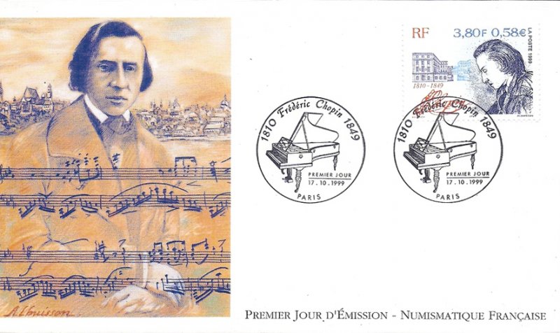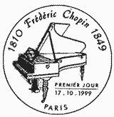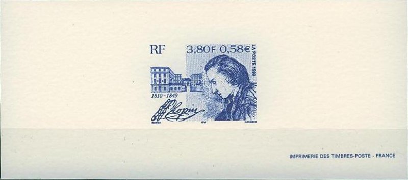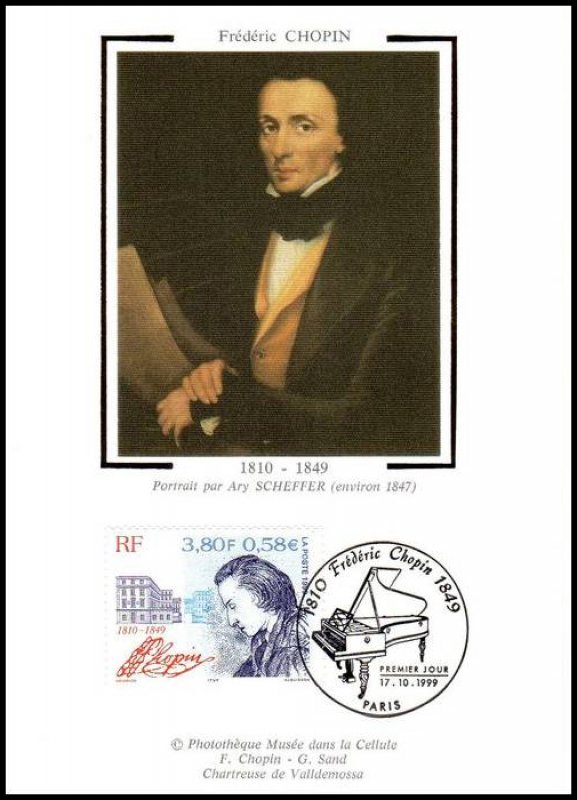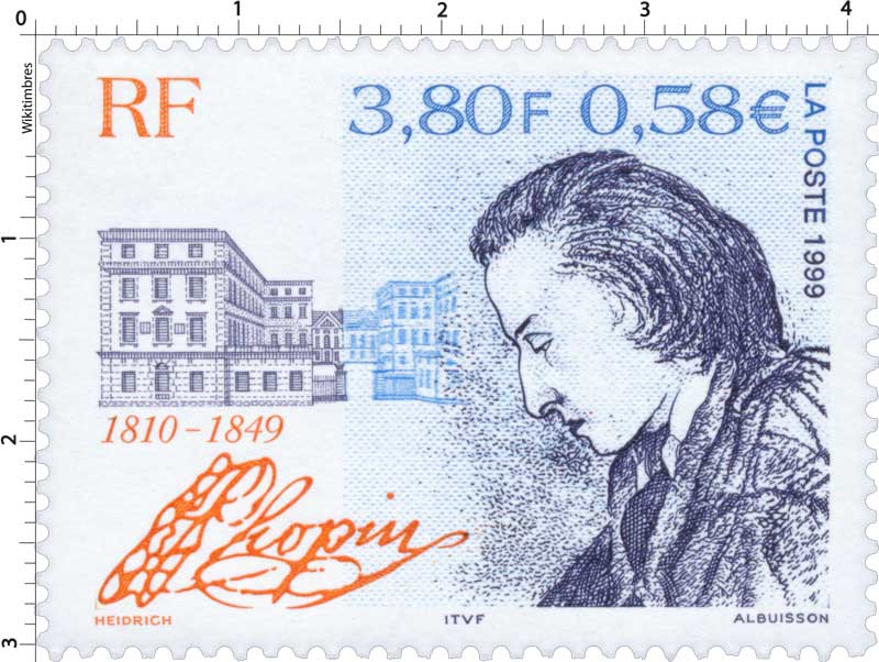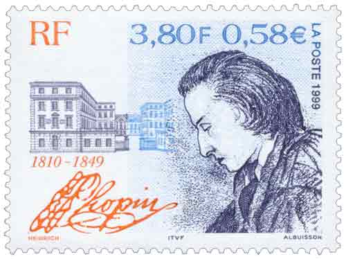 | Commentaire | Description synthétique du visuel du timbre : Frédéric Chopin figura parmi les plus grands compositeurs romantiques pour piano. Enfant imaginatif, intelligent, il donna son premier concert à l’âge de 9 ans. Sa réputation faite dans les salons de la capitale polonaise s’étendit rapidement et il quitta la Pologne en 1830 pour s’installer définitivement à Paris l’année suivante. Grâce à Liszt, il rencontra George Sand. La curiosité qu’elle lui inspira se transforma bientôt en passion. Le portrait qu’elle dessina de lui en 1841 illustre le timbre, en hommage à la culture française. Pour sa part, la culture polonaise est évoquée à travers la représentation du bâtiment de la bibliothèque de l’université dans lequel Chopin occupa un appartement durant les trois dernières années de son séjour à Varsovie. Le titre du timbre se présente sous la forme de la signature de Chopin. |
