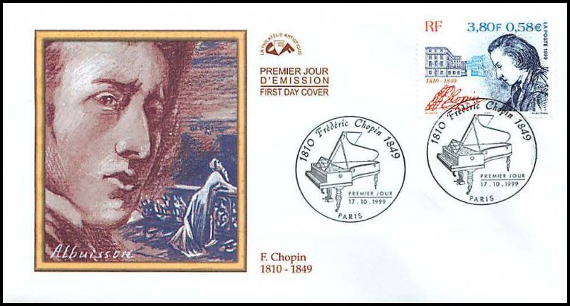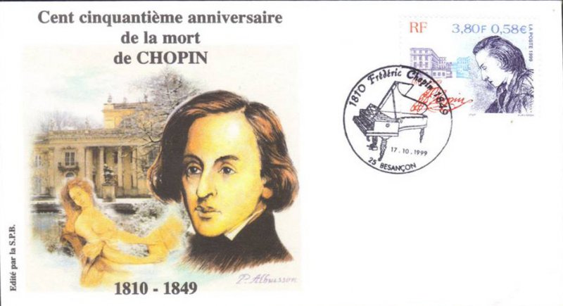 | Description | 150e anniversaire de la mort de Frédéric Chopin (1810-1849), mort à Paris. Représentation du portrait du musicien par George Sand et de l'Académie des Beaux-arts de Varsovie |
