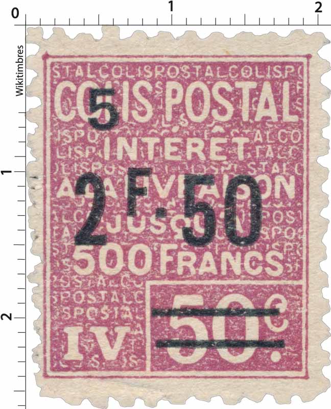 Timbre : 1926 COLIS POSTAL INTÉRÊT A LA LIVRAISON JUSQU'À 500 FRANCS Mesures Format d'imp 18 x 22 mm Dents incluses 21 x 24 mm Forme vertical Phosphore Non Impression Typographie Complément xxxxx Couleur lilas Valeur 2F,50 Dentelure 11 Emis en - Quantité - Auteurs Dessinateur xxxxx Graveur xxxxx Mise en page xxxxx Mentions - Numéros & Dates N° Philatelix CP67 N° Michel - Date d'émission 01/01/1926 Date de retrait - Classements Groupe Colis postaux 1926 intérêt à la livraison Catégorie Colis postaux Familles Usage - Régions - Départements - Description Colis postaux, surchargé Commentaire - Mes timbres & notes personnelles www.wikitimbres.fr