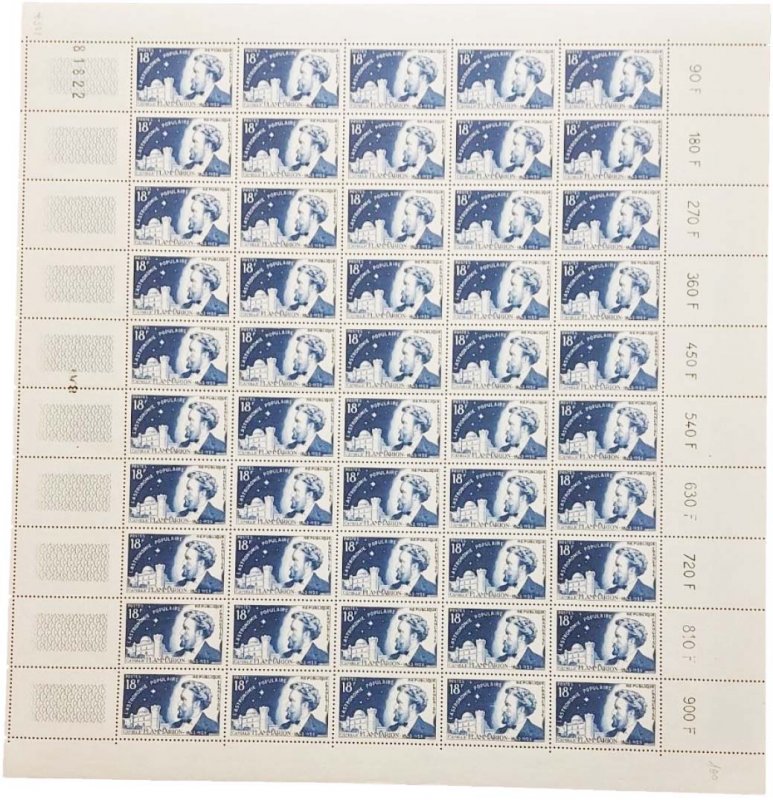 | Commentaire | Ce timbre-poste français émis en 1956 appartient à la deuxième série consacrée aux savants et vulgarisateurs français du XIXᵉ siècle et rend hommage à Camille Flammarion, figure centrale de la diffusion des connaissances astronomiques auprès du grand public. Dessiné et gravé en taille-douce par Raoul Serres, le timbre adopte un format horizontal et une composition équilibrée associant le portrait du savant à la représentation de l’observatoire de Juvisy-sur-Orge, lieu emblématique de ses travaux et de son activité de vulgarisation. Né à Montigny-le-Roi, Flammarion s’attacha très tôt à rendre accessibles les grandes questions astronomiques, notamment par son ouvrage Astronomie populaire, qui connut un succès durable et contribua à éveiller l’intérêt scientifique de générations de lecteurs. Destiné à l’affranchissement de la carte postale pour l’étranger, ce timbre associe usage postal et valorisation de la culture scientifique, illustrant la volonté de la philatélie française de 1956 de souligner le rôle fondamental de la vulgarisation dans la transmission du savoir et l’ouverture des sciences au plus grand nombre.