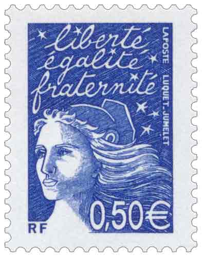 | Commentaire | Les timbres imprimés en 2001, l'ont été en feuilles monobloc de 100 (impression TD6), c'est-à-dire sans pont, séparant la feuille en deux blocs de 50TP (impression RGR), portent dans la marge supérieure la mention : « Timbres en euros mise en vente à partir du 1er janvier2002 ». Le timbre se collectionne soit en haut de feuille complète, soit en séparé avec bord de feuille attenant. Description synthétique du visuel du timbre : En janvier 2002, 15 nouvelles Marianne du 14 juillet seront émises en simple affichage euro. Le TVP, sans affichage de la valeur, est émis plus tôt (août 2001). La nouvelle série émise correspond aux : 8 pièces en euro : 0,01 € - 0,02 € - 0,05 € - 0,10 € - 0,20 € - 0,50 € - 1,00 € - 2,00 € 1er, 2e et 3e échelon de poids de la lettre zone 1, service prioritaire : TVP / 0,69 € (= 4,50 F) / 1,02 € (= 6,70 F) 1er, 2e et 3e échelon de poids de la lettre zone 1, service écopli : 0,41 € (= 2,70 F) / 0,53 € (= 3,50 F) / 0,64 € (= 4,20 F) 1er échelon de la zone 2 et 4, service prioritaire : 0,58 € (= 3,80 F) / 0,67 € (= 4,40 F). Existe avec bandes phosphorescentes brisées, cases 99 et 100. Existe non surchargé accidentellement de bandes phosphorescentes (collection en paire) |