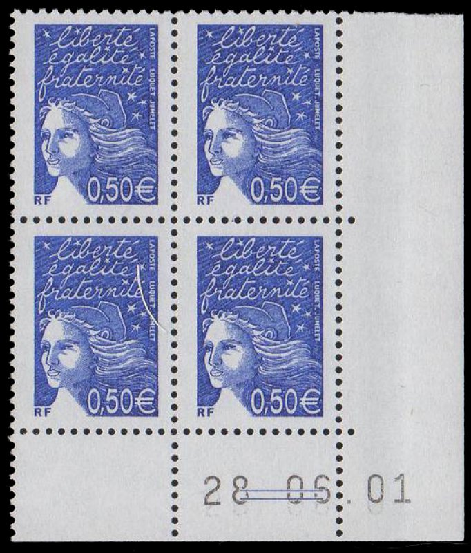 | Commentaire | Les timbres imprimés en 2001, l'ont été en feuilles monobloc de 100 (impression TD6), c'est-à-dire sans pont, séparant la feuille en deux blocs de 50TP (impression RGR), portent dans la marge supérieure la mention : « Timbres en euros mise en vente à partir du 1er janvier2002 ». Le timbre se collectionne soit en haut de feuille complète, soit en séparé avec bord de feuille attenant. Description synthétique du visuel du timbre : En janvier 2002, 15 nouvelles Marianne du 14 juillet seront émises en simple affichage euro. Le TVP, sans affichage de la valeur, est émis plus tôt (août 2001). La nouvelle série émise correspond aux : 8 pièces en euro : 0,01 € - 0,02 € - 0,05 € - 0,10 € - 0,20 € - 0,50 € - 1,00 € - 2,00 € 1er, 2e et 3e échelon de poids de la lettre zone 1, service prioritaire : TVP / 0,69 € (= 4,50 F) / 1,02 € (= 6,70 F) 1er, 2e et 3e échelon de poids de la lettre zone 1, service écopli : 0,41 € (= 2,70 F) / 0,53 € (= 3,50 F) / 0,64 € (= 4,20 F) 1er échelon de la zone 2 et 4, service prioritaire : 0,58 € (= 3,80 F) / 0,67 € (= 4,40 F). Existe avec bandes phosphorescentes brisées, cases 99 et 100. Existe non surchargé accidentellement de bandes phosphorescentes (collection en paire) |