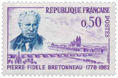 | Commentaire | Émis en février 1962 pour commémorer le centenaire de la mort de Pierre-Fidèle Bretonneau, ce timbre s’inscrit dans une tradition philatélique française attentive à la valorisation des grandes figures scientifiques nationales, en particulier celles dont l’action a contribué à structurer durablement la médecine moderne. À travers cette émission, l’administration des Postes rappelle le rôle central joué par l’École médicale de Tours, foyer ancien d’enseignement et de recherche, dont Bretonneau fut l’un des représentants les plus emblématiques par sa méthode fondée sur l’observation clinique rigoureuse et la confrontation systématique des faits aux données anatomiques. Le choix de ce sujet reflète l’importance accordée, au début des années 1960, à l’histoire des progrès médicaux dans un contexte de modernisation du système de santé et de reconnaissance des sciences expérimentales, tandis que l’arrière-plan évoquant la ville de Tours ancre symboliquement l’hommage dans le territoire où s’est déployée l’essentiel de son œuvre. Le timbre ne célèbre pas seulement un homme, mais une démarche scientifique fondée sur la distinction entre le fait et l’opinion, annonciatrice des développements ultérieurs de l’épidémiologie et de la pensée médicale contemporaine. Article rédigé pour WikiTimbres |
