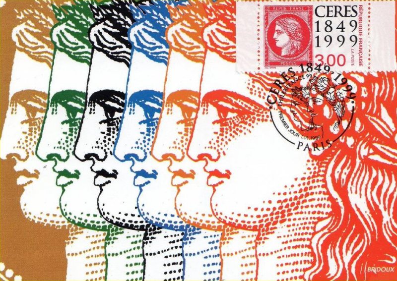 | Commentaire | Description synthétique du visuel du timbre : Reprise sur chacun des timbres du visuel des Cérès rouge et noire, premiers timbres français émis en 1849. La vignette de tête du carnet est illustrée par le logotype de Philexfrance 99 et comporte le texte ‘le timbre-poste français a 150 ans’. Voir la vidéo "Histoires de timbres" En savoir plus sur Wikipédia : Cérès |