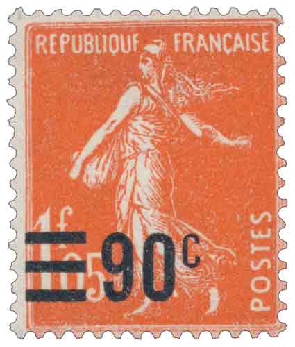 Surcharge 90 c sur 1 f 05 vermillon du type Semeuse fond plein à inscriptions grasses, tirée en octobre 1926 pour répondre à l’augmentation rapide des tarifs postaux. Le timbre réutilise la valeur 1 f 05 de Roty, dont la plaque typographique avait été abondamment exploitée depuis 1925, et reçoit ici une surcharge rouge uniforme, caractéristique de la série d’ajustements tarifaires de 1926-1927. L’exemplaire appartient à la dernière phase d’utilisation de la Semeuse camée avant la généralisation progressive du type Pasteur sur les valeurs supérieures. |